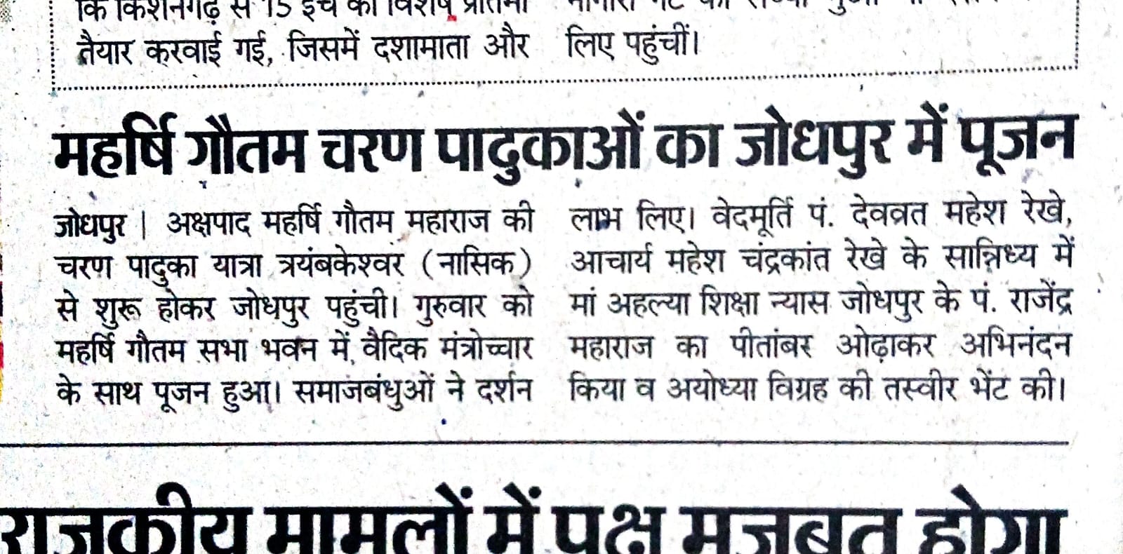 अक्षपाद महर्षि गौतम जी महाराज की पावन चरण पादुका यात्रा त्र्यंबकेश्वर (नाशिक) से प्रारंभ होकर जोधपुर पहुँची, जहाँ समाज बंधुओं द्वारा भव्य स्वागत किया गया। चैत्र नववर्ष एवं महर्षि गौतम जयंती के अवसर पर कुशावर्त, गोदावरी तट पर वैदिक मंत्रोच्चारण के साथ पूजन-अर्चन कर यात्रा का शुभारंभ किया गया।